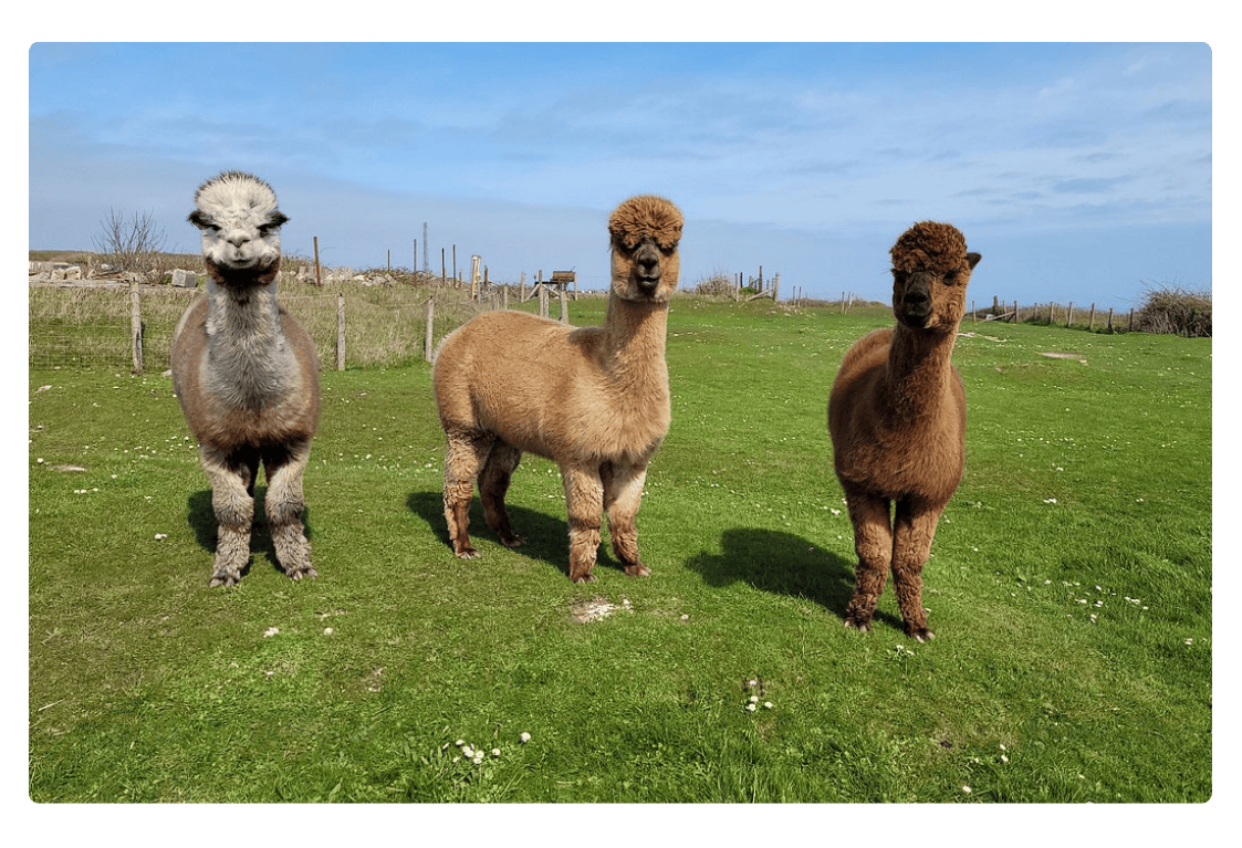 OPTION: Alpaca Walk (Purchase during the booking process)Join us for a gentle, guided alpaca walk enjoying stunning Jurassic Coast views with these charming Alpacas.